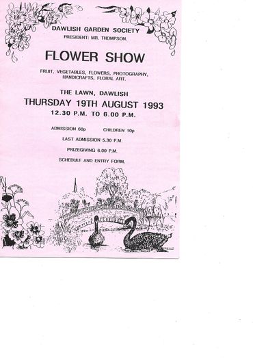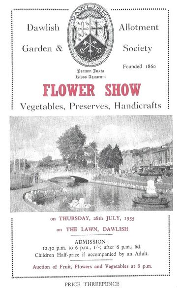 1935 saw the formation of the Dawlish Unemployed Allotment Association and in the following year the merger into the Dawlish and District Garden and Allotment Society, with an annual subscription of 1/-. The new Chairman, Mr Douglas Bishop remains in this post until 1961. 1945 saw the first summer show after WW2, which was held in The Hut, in later years it moved to the grounds of the Manor House and from 1953—1977 to a marquee on The Lawns